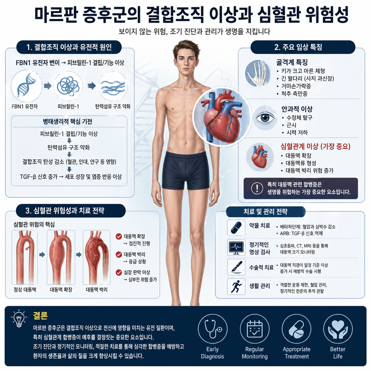 결국 마르판 증후군 관리의 핵심은 보이지 않는 위험을 미리 발견하고, 꾸준히 관리하는 것이라고 할 수 있습니다.